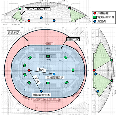 本施設の中心となるメインアリーナは、スポーツから軽音楽イベント、展示会などを行う多目的アリーナであり、拡声音の明瞭性の確保、外部への音漏れ防止が非常に重要な要素となりました。