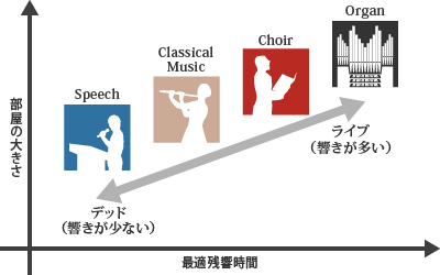 AFC(Active Field Control)とは、最新の電気音響・信号処理技術を用いて、室内の響きや空間の拡がり・音量感などの建築音響の聴感印象を、自然に変化させることができるシステムです。室内の最適な響きの長さは、行われる演目によって異なります。例えばクラシック音楽には、楽音を豊かにする響きのある空間が適しており、演劇や講演会には、響きの少ない明瞭な空間が適しています。