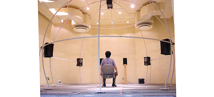 可聴化とは「聴く」ことができるようにする技術のことをいい、コンピュータシミュレーションや模型実験により算出した結果を用いて、ホールの音響設計に活用しています。3次元の立体的な音場を模擬することができる「3次元音場再生システム」を採用し、設計段階における音場の聴感的な評価・確認を行っています。「3次元音場再生システム」とは、無響室内に配置された複数のスピーカーから再生するシステムであり、空間の拡がりや音源の移動などの空間的な印象を3次元的に再現することのできる多チャンネル再生システムの一つです。