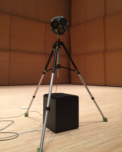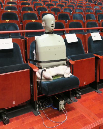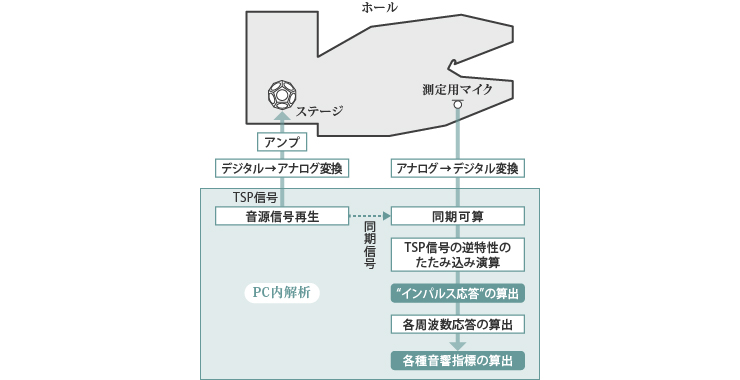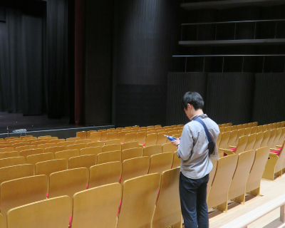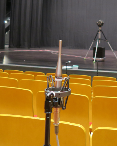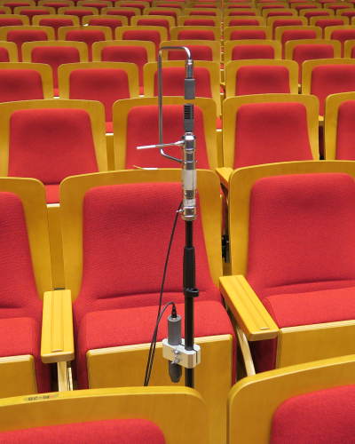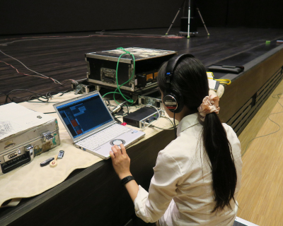 設計意図通りの音響特性が得られているかを詳細に確認するため、実際の音場内でインパルス応答の測定を行います。測定は異なる音場間の比較検討を行うために、一定の方法で行います。音源スピーカーには12面体無指向性スピーカーを、また入力信号には単位周波数あたりのエネルギーが大きいスイープ正弦波信号(Time Stretched Pulse)を用い、受音点での応答に入力信号の時間軸を反転した信号をたたみ込んで、インパルス応答を算出します。受音には無指向性マイクや双指向性マイクを用いてさまざまな室内音響指標を算出し、評価します。また、インパルス応答のほかにも、遮音測定や騒音測定、振動測定、電気音響測定なども行います。