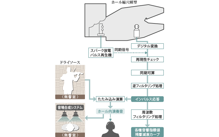 音響模型による主観評価の有効性は極めて高く、模型内ダミーヘッド両耳で得られた測定データにデジタル信号処理技術によって測定系の補正をかけたインパルス応答と、ドライソースとを畳み込んで聴感的に音場を評価することが可能です。(ハイブリッド・シミュレーション法)