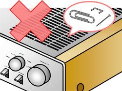 パネルのすき間、放熱用の通風口、ディスクの挿入口、スピーカーのポートなどから金属や紙片などの異物が入らないように注意してください。